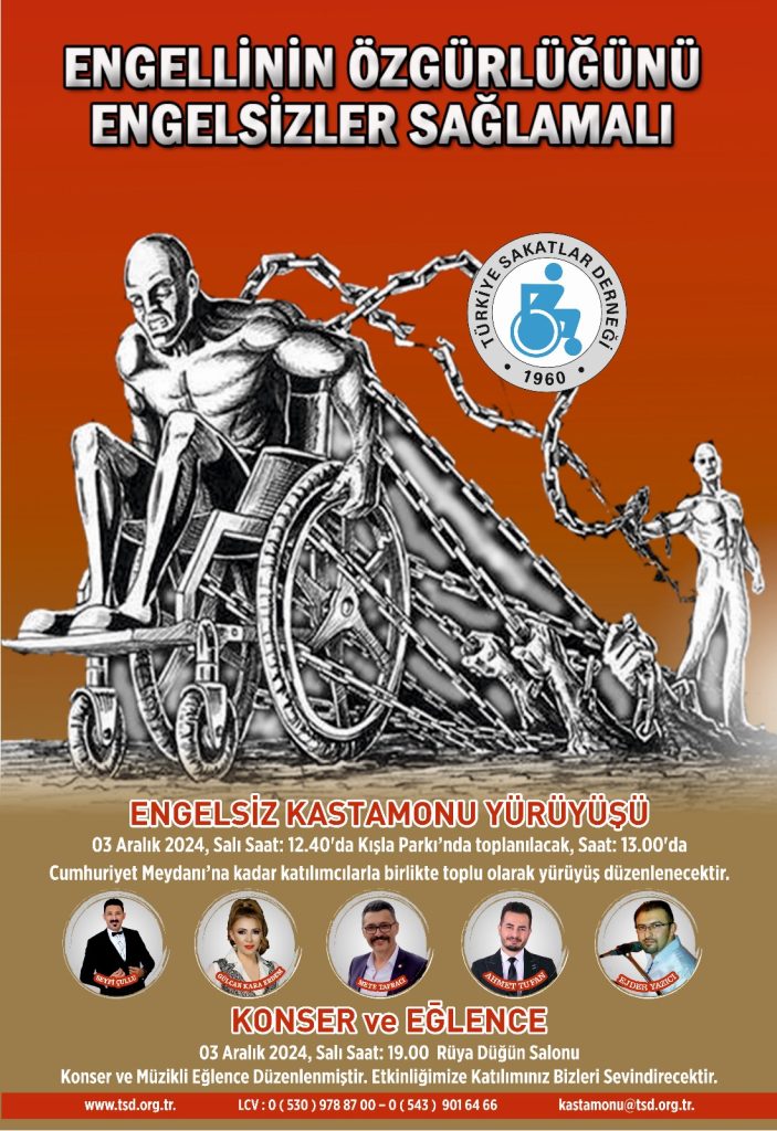 3 Aralık Dünya Engelliler Günü’ne özel olarak Türkiye Sakatlar Derneği Kastamonu Temsilciliği, öğlen yürüyüş, akşam ise konser düzenleyeceklerini bildirdi.