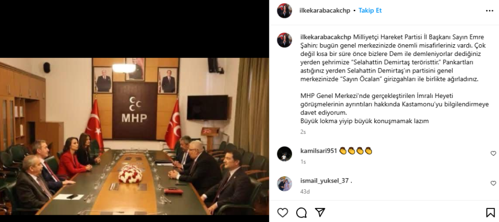 Karabacak sosyal medya üzerinden şu ifadelerde bulundu;”Milliyetçi Hareket Partisi İl Başkanı Sayın Emre Şahin; bugün genel merkezinizde önemli misafirleriniz vardı. Çok değil kısa bir süre önce bizlere Dem ile demleniyorlar dediğiniz yerden şehrimize “Selahattin Demirtaş teröristtir.” Pankartları astığınız yerden Selahattin Demirtaş’ın partisini genel merkezinizde “Sayın Öcalan” girizgahları ile birlikte ağırladınız.MHP Genel Merkezi’nde gerçekleştirilen İmralı Heyeti görüşmelerinin ayrıntıları hakkında Kastamonu’yu bilgilendirmeye davet ediyorum.Büyük lokma yiyip büyük konuşmamak lazım”dedi.