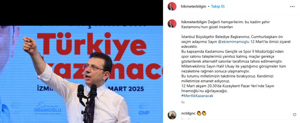 Hikmet Erbilgin’in sosyal medya hesaplarından yapmış olduğu açıklaması:”Değerli hemşerilerim, bu kadim şehir Kastamonu’nun güzel insanları,İstanbul Büyükşehir Belediye Başkanımız, Cumhurbaşkanı ön seçim adayımız Sayın Ekrem İmamoglu 12 Mart’ta ilimizi ziyaret edecektir.Bu kapsamda Kastamonu Gençlik ve Spor İl Müdürlüğü’nden spor salonu taleplerimiz yanıtsız kalmış, maçlar gerekçe gösterilerek alternatif salonlar tarafımıza tahsis edilmemiştir. Milletvekilimiz Sayın Halil Uluay ile yaptığımız görüşmeler tüm nezaketine rağmen sonuca ulaşmamıştır.Bu tutumu milletimizin takdirine bırakıyoruz. Kendimizi milletimize emanet ediyoruz.12 Mart akşam 20.30’da Kuzeykent Pazar Yeri’nde Sayın İmamoğlu’nu ağırlayacağız.”dedi.