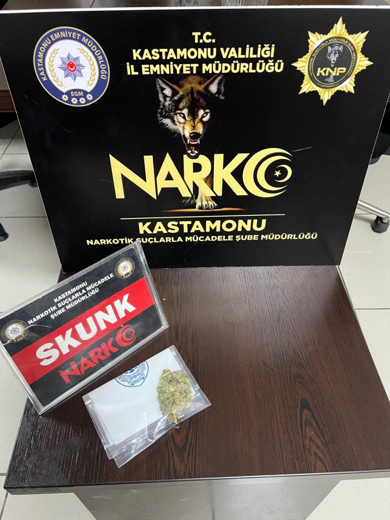 Kastamonu İl Emniyet Müdürlüğüne bağlı Narkotik Suçlarla Mücadele Şube Müdürlüğünce uyuşturucu madde kullanan ve satan şahıslara yönelik yapılan çalışmalarda tespiti yapılan bir şahsın üzerinde arama gerçekleştirildi. Yapılan aramada 7,90 gram skunk maddesi ele geçirildi.