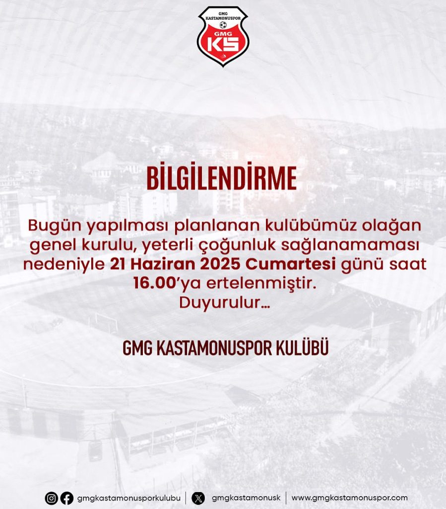 GMG Kastamonuspor Kulübü’nde bugün gerçekleştirilmesi planlanan Olağan Genel Kurul, yeterli çoğunluğun sağlanamaması nedeniyle ileri bir tarihe ertelendi.