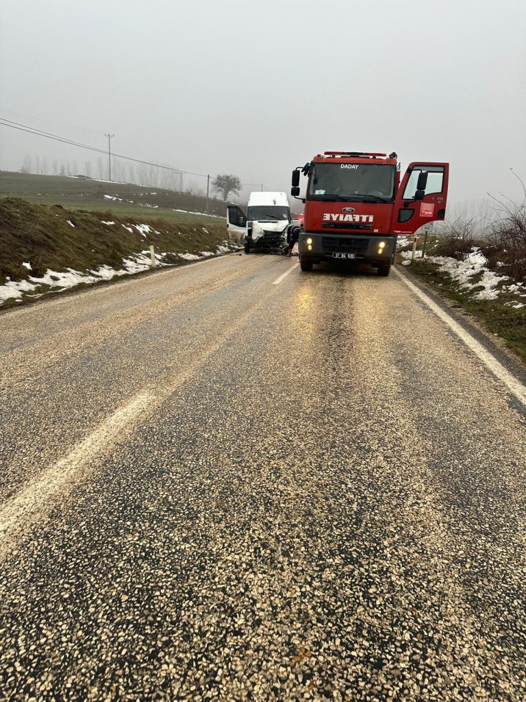 Kastamonu’nun Daday ilçesi eflani yolu mevkiinde yogun sisin bastırması sonucu kaza meydana geldi.Meydana gelen kazada otomobil ile minibüs kafa kafaya çarpışırken,otomobil ikiye bölündü.gerçekleşmiş olan kazada H.M. Ç.Ş. O.Ö. yaralandı.Ekiplerce yaralılar Kastamonu Eğitim ve Araştırma Hastanesi’ne sevk edildiler.