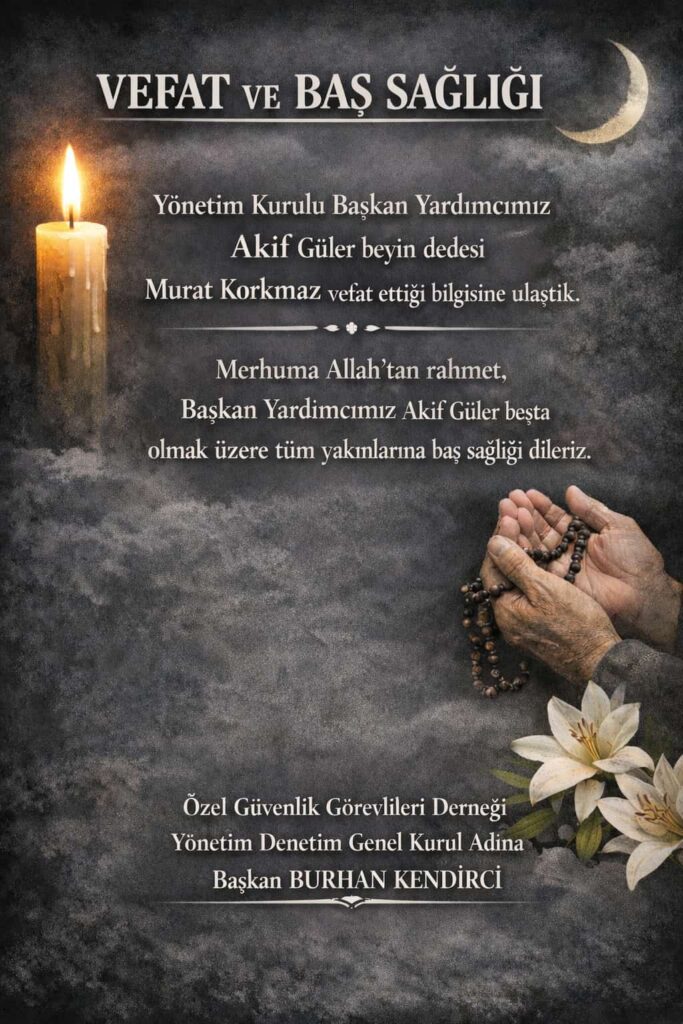 Özel Güvenlik Görevlileri Derneği’nden yapılan açıklamada, Yönetim Kurulu Başkan Yardımcısı Akif Güler’in dedesi Murat Korkmaz’ın vefat ettiği bilgisine ulaşıldığı belirtildi.