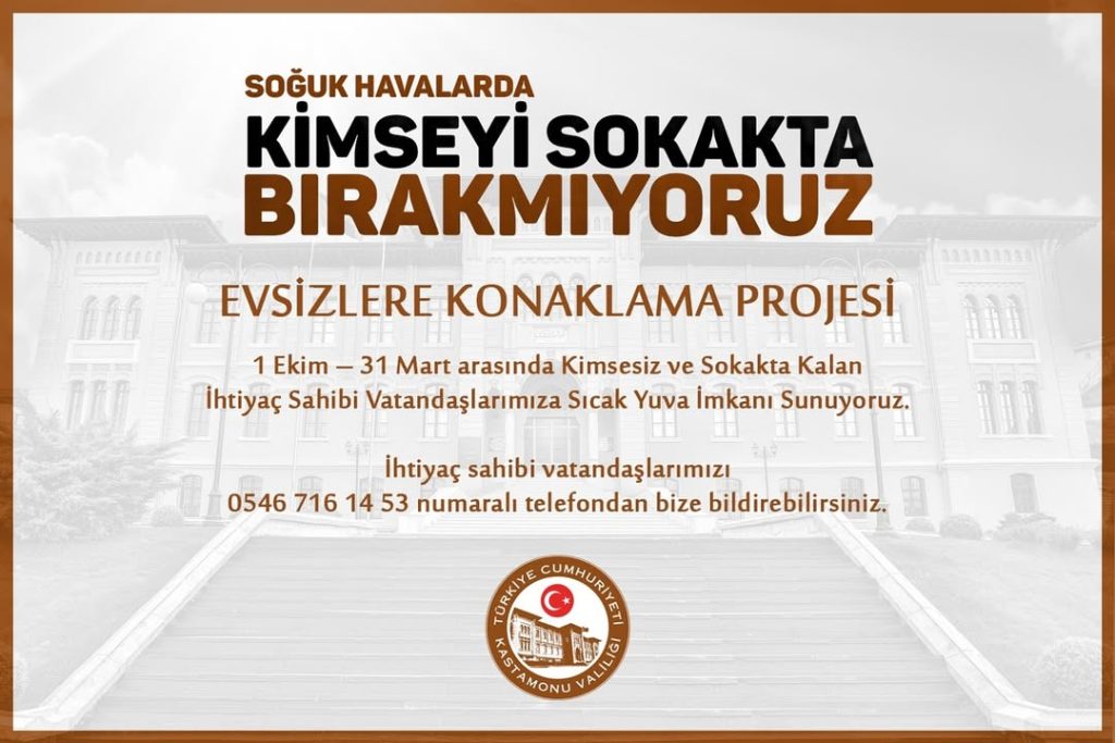 “Sosyal Devlet İlkesi” anlayışı doğrultusunda Aile ve Sosyal Hizmetler Bakanlığımızın destekleriyle Sosyal Yardımlaşma ve Dayanışma Vakfı (SYDV) tarafından hayata geçirilen “Evsizlere Konaklama Projesi” ile ihtiyaç sahibi, kimsesiz ve sokakta kalan vatandaşlarımıza kış mevsimi süresince sıcak yuva ve umut olacağız. Vatandaşlarımızı ağır kış şartlarından korumak ve ev konforu içerisinde hayatlarını sürdürmelerini sağlamak için hayata geçirdiğimiz ve 1 Ekim– 31 Mart tarihleri arasında uygulayacağımız proje ile devletimizin şefkat eli, sokakta kalan, herhangi bir kurum hizmetinden yararlanamayan, kimsesiz ve gidecek yeri olmayan vatandaşların üzerinde olacak.İhtiyaç sahibi vatandaşlarımızı 0546 716 14 53 numaralı telefondan bize bildirebilirsiniz”denildi.