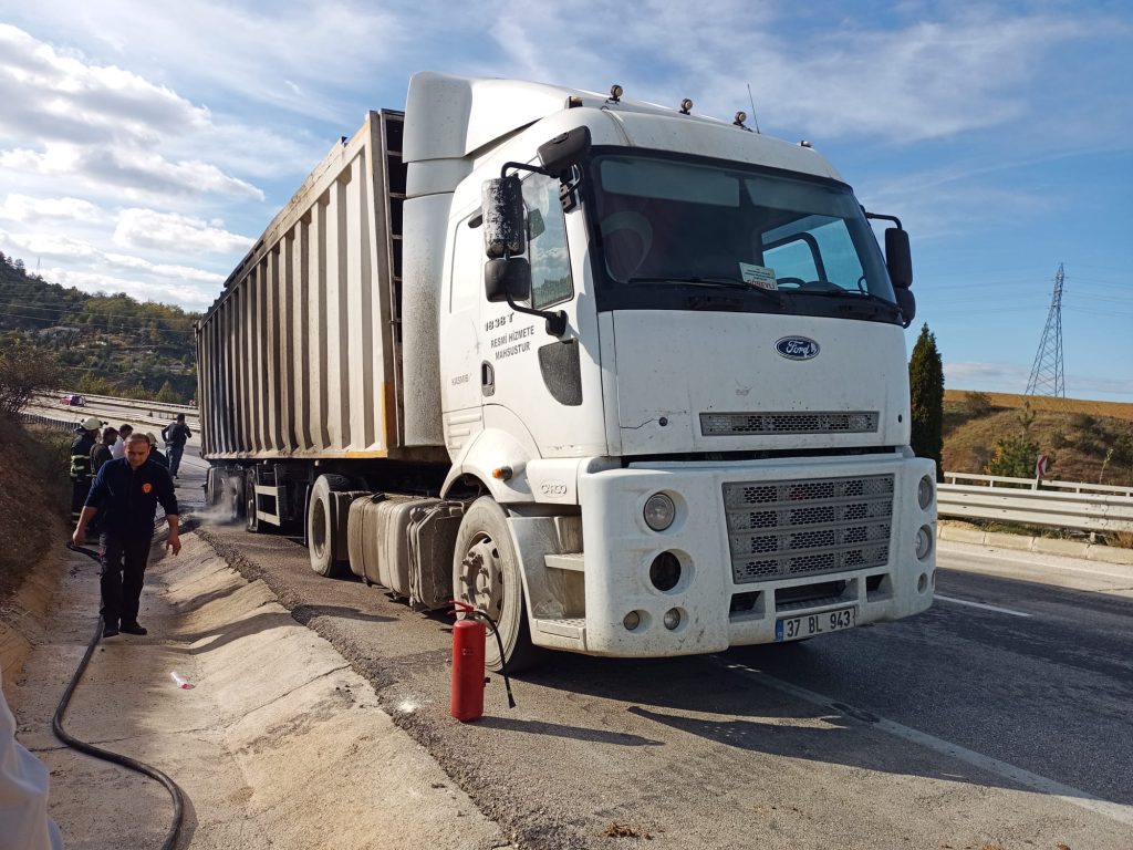 Kastamonu Doğu Çevre yolunda Mahalli İdareler Birliği’ne ait Çöp nakil tırının dorse tekerlekleri alev aldı.