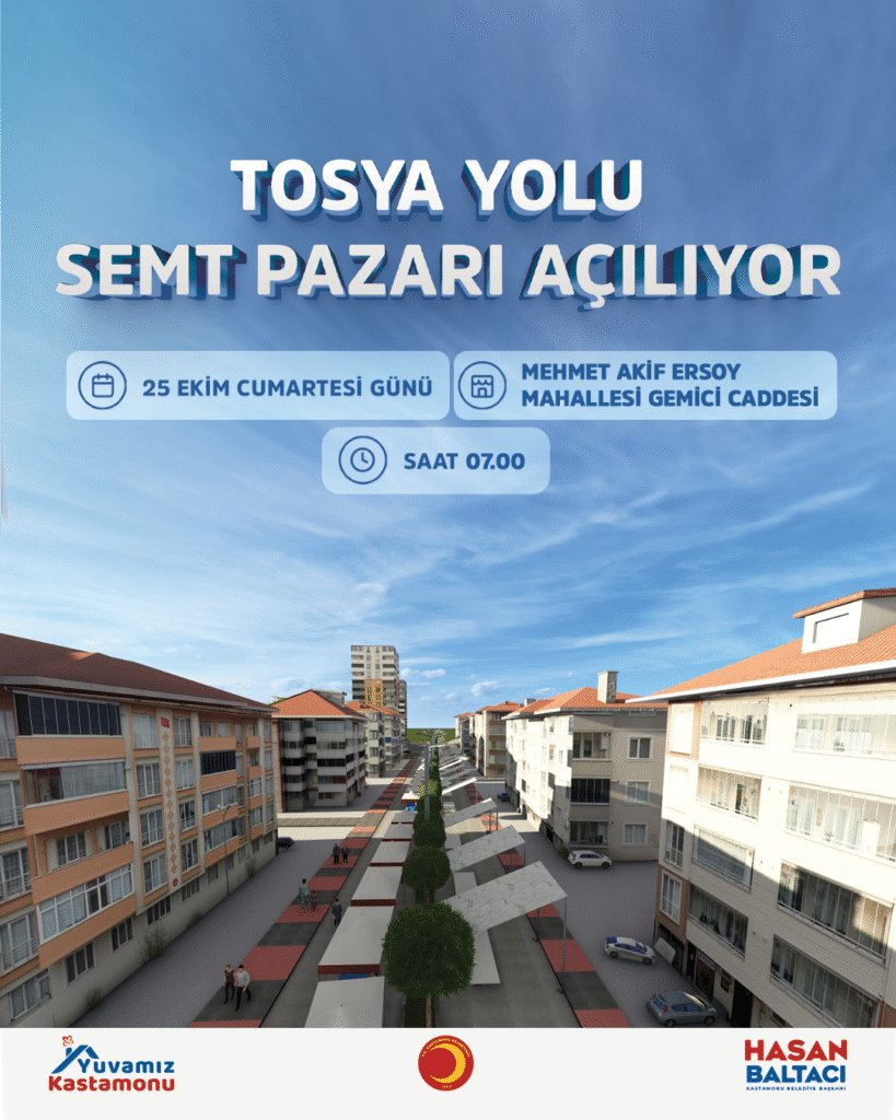 Bölgenin ihtiyaçlarını karşılayacak, vatandaşlara rahat ve konforlu bir alışveriş imkânı sunacak Tosya Yolu Semt Pazarı, 25 Ekim Cumartesi günü saat 07.00’de açılacak, akşam saat 21.00’e kadar hizmet verecek. Yeni pazarın, mevcut Salı Pazarı’nın da yükünü hafifletmesi bekleniyor.