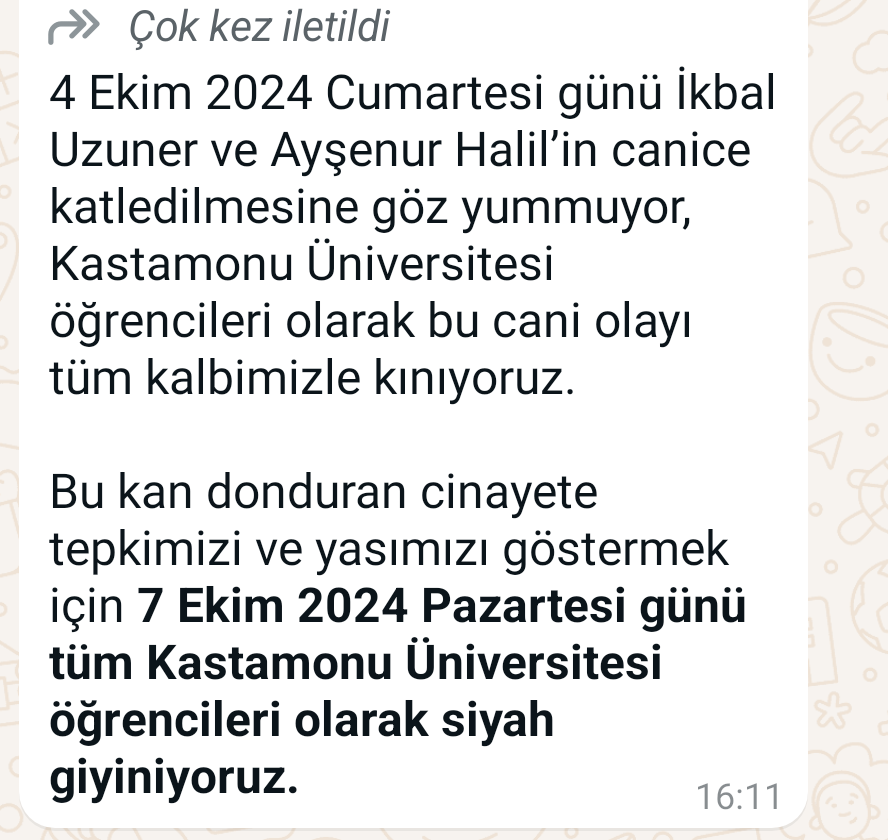 “4 Ekim 2024 Cumartesi günü İkbal Uzuner ve Ayşenur Halil’in canice katledilmesine göz yummuyor, Kastamonu Üniversitesi öğrencileri olarak bu cani olayı tüm kalbimizle kınıyoruz.