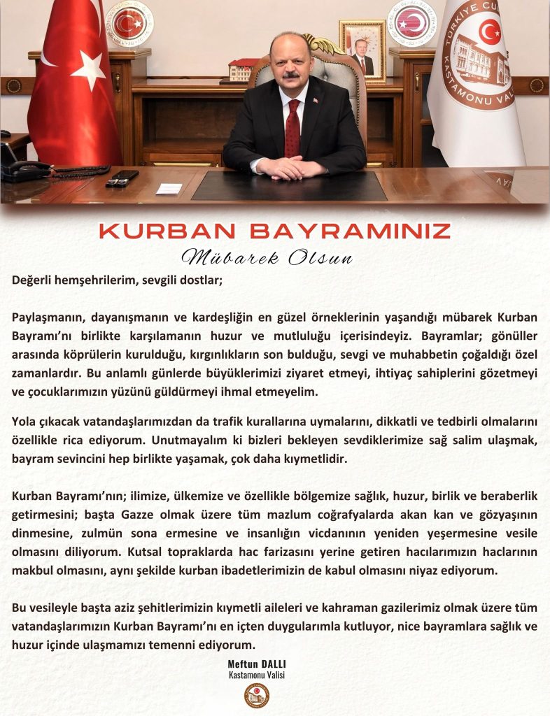 Kurban Bayramına özel Kastamonu Valisi Meftun Dallı, sosyal medya üzerinden mesaj yayınladı.
