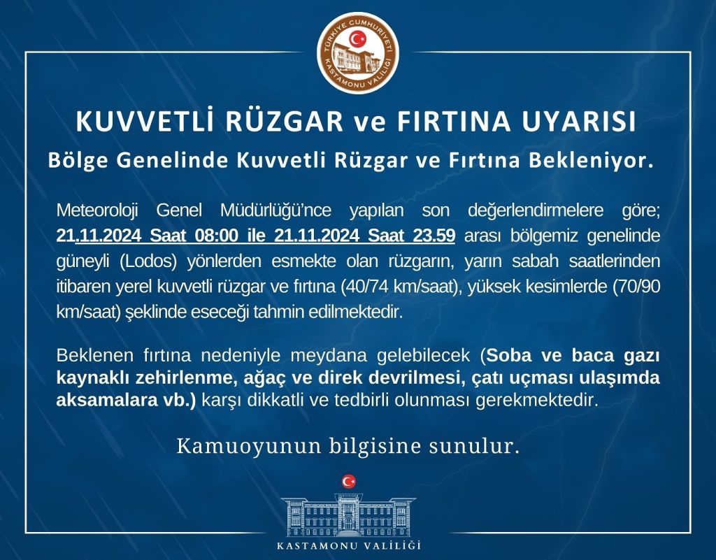 “Meteoroloji Genel Müdürlüğünce yapılan son değerlendirmelere göre; 21.11.2024 Saat 08:00 ile 21.11.2024 Saat 23.59 arası bölgemiz genelinde güneyli (Lodos) yönlerden esmekte olan rüzgann, yanın sabah saatlerinden itibaren yerel kuvvetli rüzgar ve fırtına (40/74 km/saat), yüksek kesimlerde (70/90 km/saat) şeklinde eseceği tahmin edilmektedir.Beklenen fırtına nedeniyle meydana gelebilecek (Soba ve baca gazı kaynaklı zehirlenme, ağaç ve direk devrilmesi, çatı uçması ulaşımda aksamalara vb.) karşı dikkatli ve tedbirli olunması gerekmektedir.Kamuoyunun bilgisine sunulur.”denildi.
