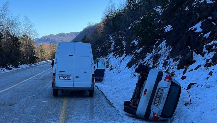 Kastamonu’nun Cide ilçesi ile Şenpazar arası Dağlı mevkiinde yoldaki buzlanma nedeniyle sürücünün direksiyon hakimiyetini kaybetmesi sonucu meydana gelen kazada, otomobil takla atarak yan devrildi.