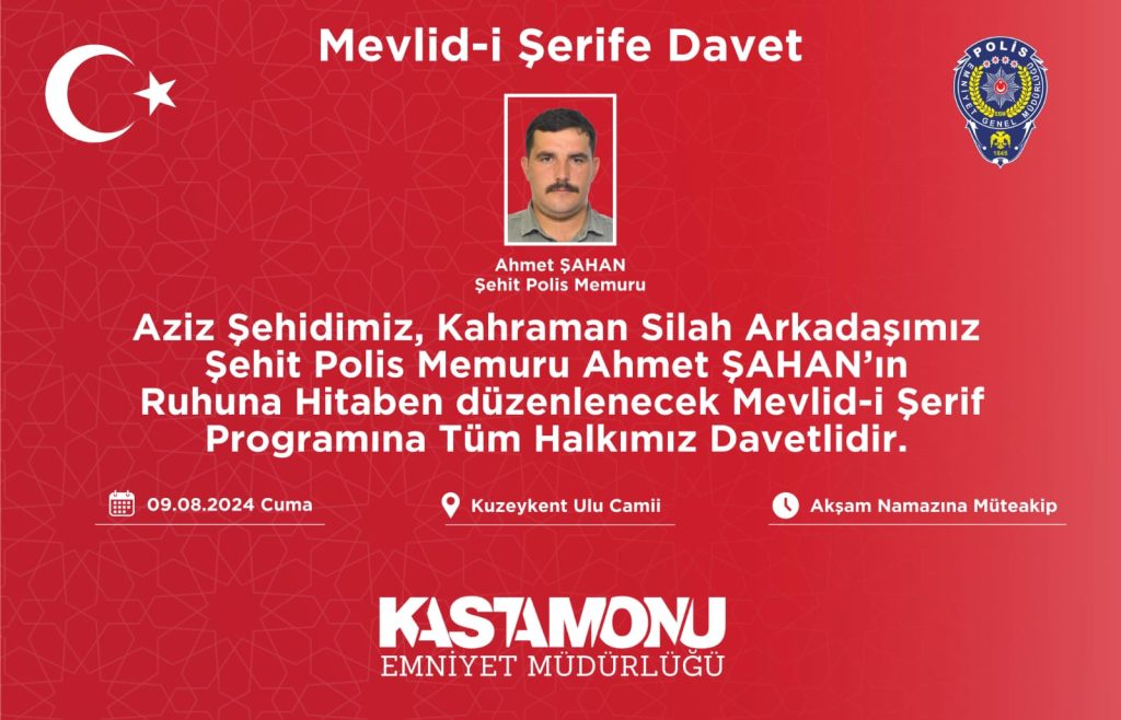 1 Ağustos günü uyuşturucu bağımlısı ve cezaevi firarisi bir şahıs tarafından silahla vurulup şehit olmuş olan polis memuru Ahmet Şahan için Kastamonu İl Emniyet Müdürlüğü Mevlid düzenleyecek.