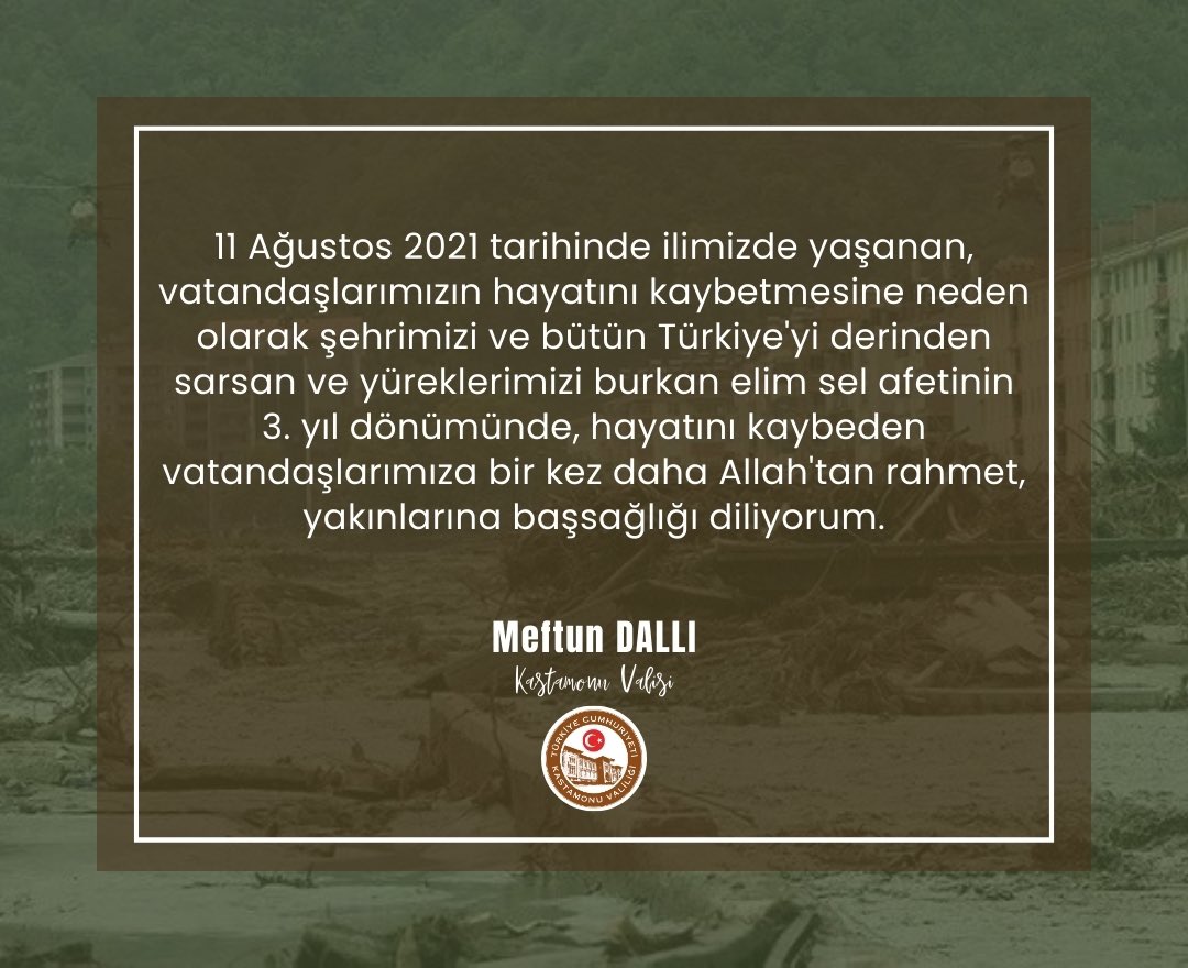 “11 Ağustos 2021 tarihinde ilimizde yaşanan, vatandaşlarımızın hayatını kaybetmesine neden olarak şehrimizi ve bütün Türkiye’yi derinden sarsan ve yüreklerimizi burkan elim sel afetinin 3. yıl dönümünde, hayatını kaybeden vatandaşlarımıza bir kez daha Allah’tan rahmet, yakınlarına başsağlığı diliyorum.”dedi.