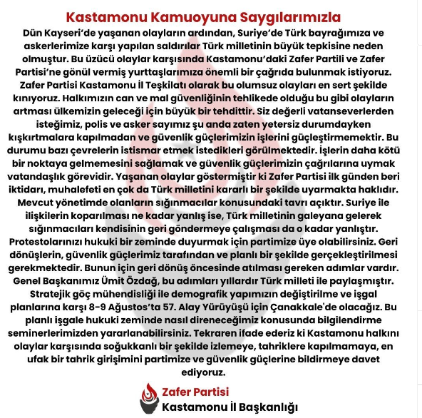 Dün Kayseri’de yaşanan olayların ardından, Suriye’de Türk bayrağımıza ve askerlerimize karşı yapılan saldırılar Türk milletinin büyük tepkisine neden olmuştur. Bu üzücü olaylar karşısında Kastamonu’daki Zafer Partili ve Zafer Partisi’ne gönül vermiş yurttaşlarımıza önemli bir çağrıda bulunmak istiyoruz. Zafer Partisi Kastamonu İl Teşkilatı olarak bu olumsuz olayları en sert şekilde kınıyoruz. Halkımızın can ve mal güvenliğinin tehlikede olduğu bu gibi olayların artması ülkemizin geleceği için büyük bir tehdittir. Siz değerli vatanseverlerden isteğimiz, polis ve asker sayımız şu anda zaten yetersiz durumdayken kışkırtmalara kapılmadan ve güvenlik güçlerimizin işlerini güçleştirmemektir. Bu durumu bazı çevrelerin istismar etmek istedikleri görülmektedir. İşlerin daha kötü bir noktaya gelmemesini sağlamak ve güvenlik güçlerimizin çağrılarına uymak vatandaşlık görevidir. Yaşanan olaylar göstermiştir ki Zafer Partisi ilk günden beri iktidarı, muhalefeti en çok da Türk milletini kararlı bir şekilde uyarmakta haklıdır. Mevcut yönetimde olanların sığınmacılar konusundaki tavrı açıktır. Suriye ile ilişkilerin koparılması ne kadar yanlış ise, Türk milletinin galeyana gelerek sığınmacıları kendisinin geri göndermeye çalışması da o kadar yanlıştır. Protestolarınızı hukuki bir zeminde duyurmak için partimize üye olabilirsiniz. Geri dönüşlerin, güvenlik güçlerimiz tarafından ve planlı bir şekilde gerçekleştirilmesi gerekmektedir. Bunun için geri dönüş öncesinde atılması gereken adımlar vardır. Genel Başkanımız Ümit Özdağ, bu adımları yıllardır Türk milleti ile paylaşmıştır. Stratejik göç mühendisliği ile demografik yapımızın değiştirilme ve işgal planlarına karşı 8-9 Ağustos’ta 57. Alay Yürüyüşü için Çanakkale’de olacağız. Bu planlı işgale hukuki zeminde nasıl direneceğimiz konusunda bilgilendirme seminerlerimizden yararlanabilirsiniz. Tekraren ifade ederiz ki Kastamonu halkını olaylar karşısında soğukkanlı bir şekilde izlemeye, tahriklere kapılmamaya, en ufak bir tahrik girişimini partimize ve güvenlik güçlerine bildirmeye davet ediyoruz.”denildi.