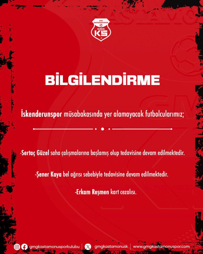 Buna göre Kastamonuspor’da 3 kişi İskenderunspor müsakabasında yer almayacak.